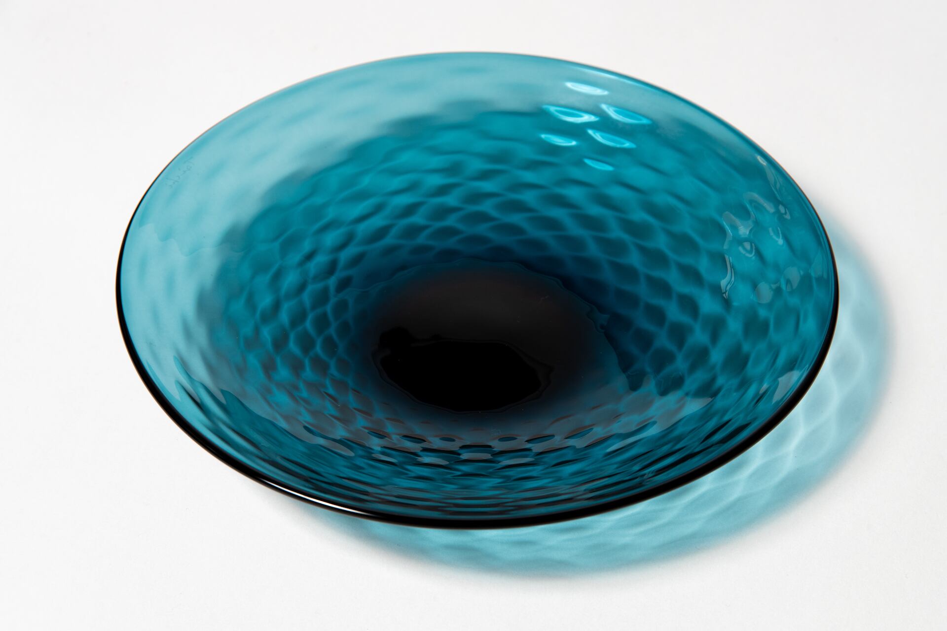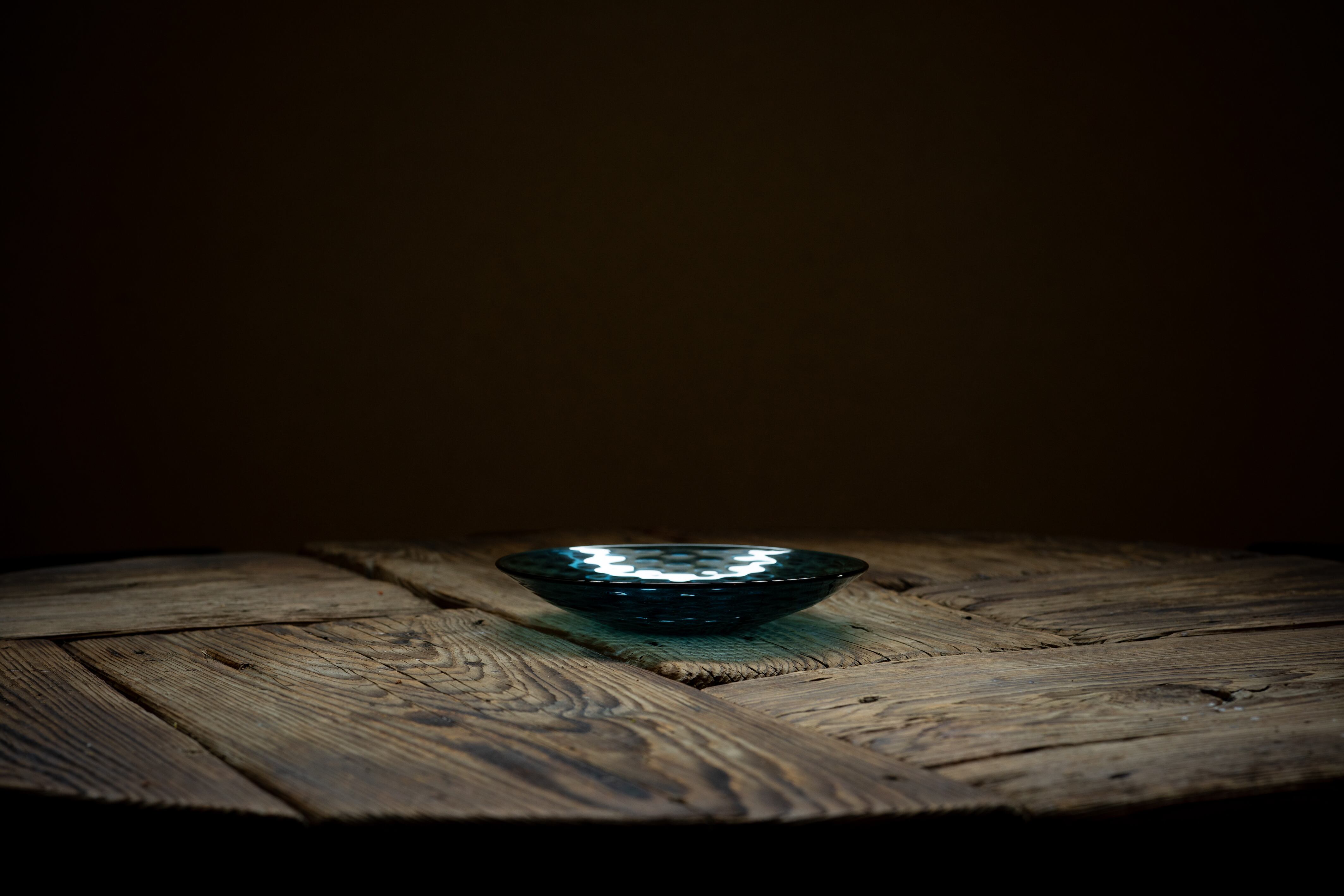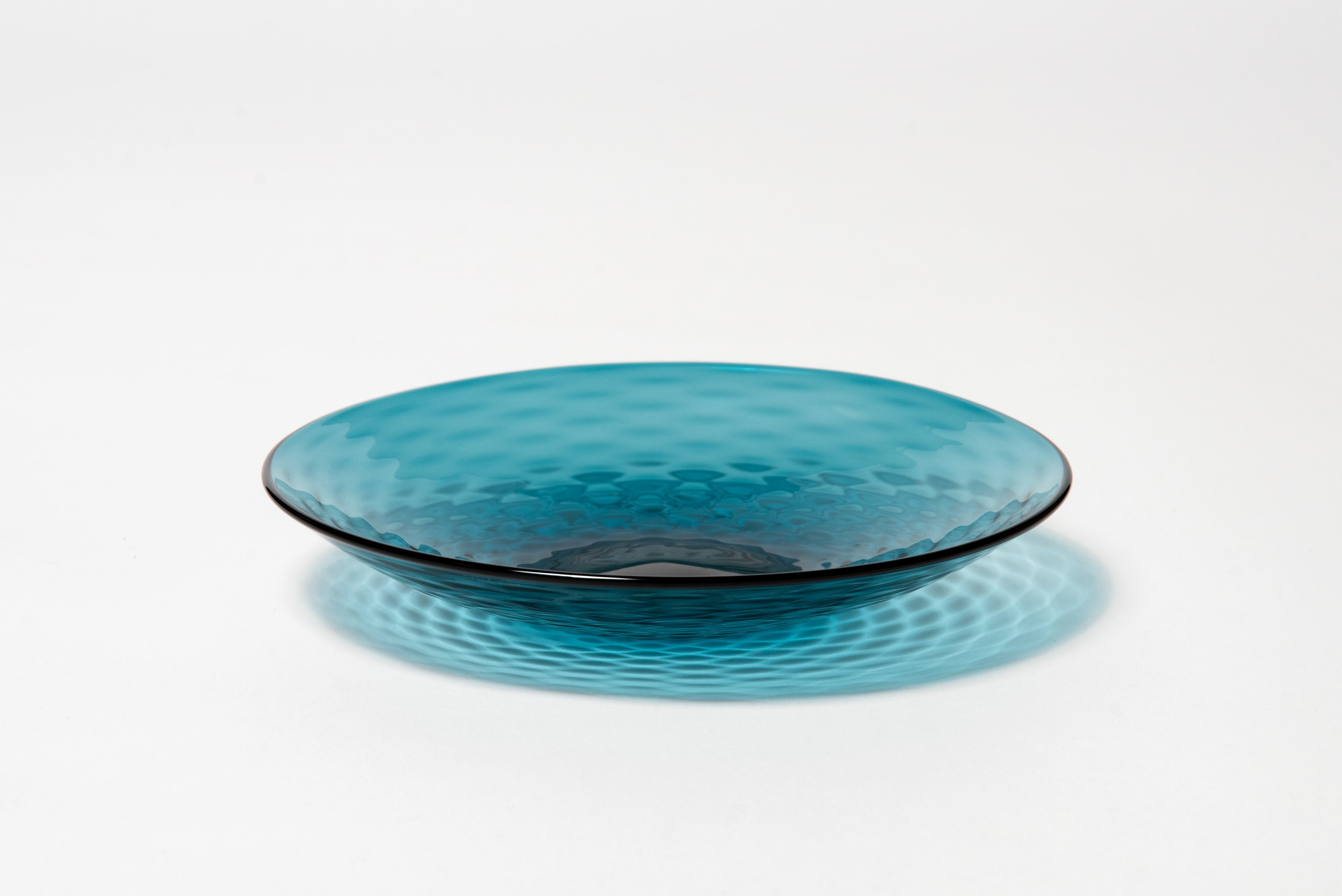 水の波紋と琉璃色美しいガラス皿。温度により液体にも固体にも変化するガラスの流動的な性質が、水のようでもあり、『Osmosis 滲透』の世界観を象徴する作品。