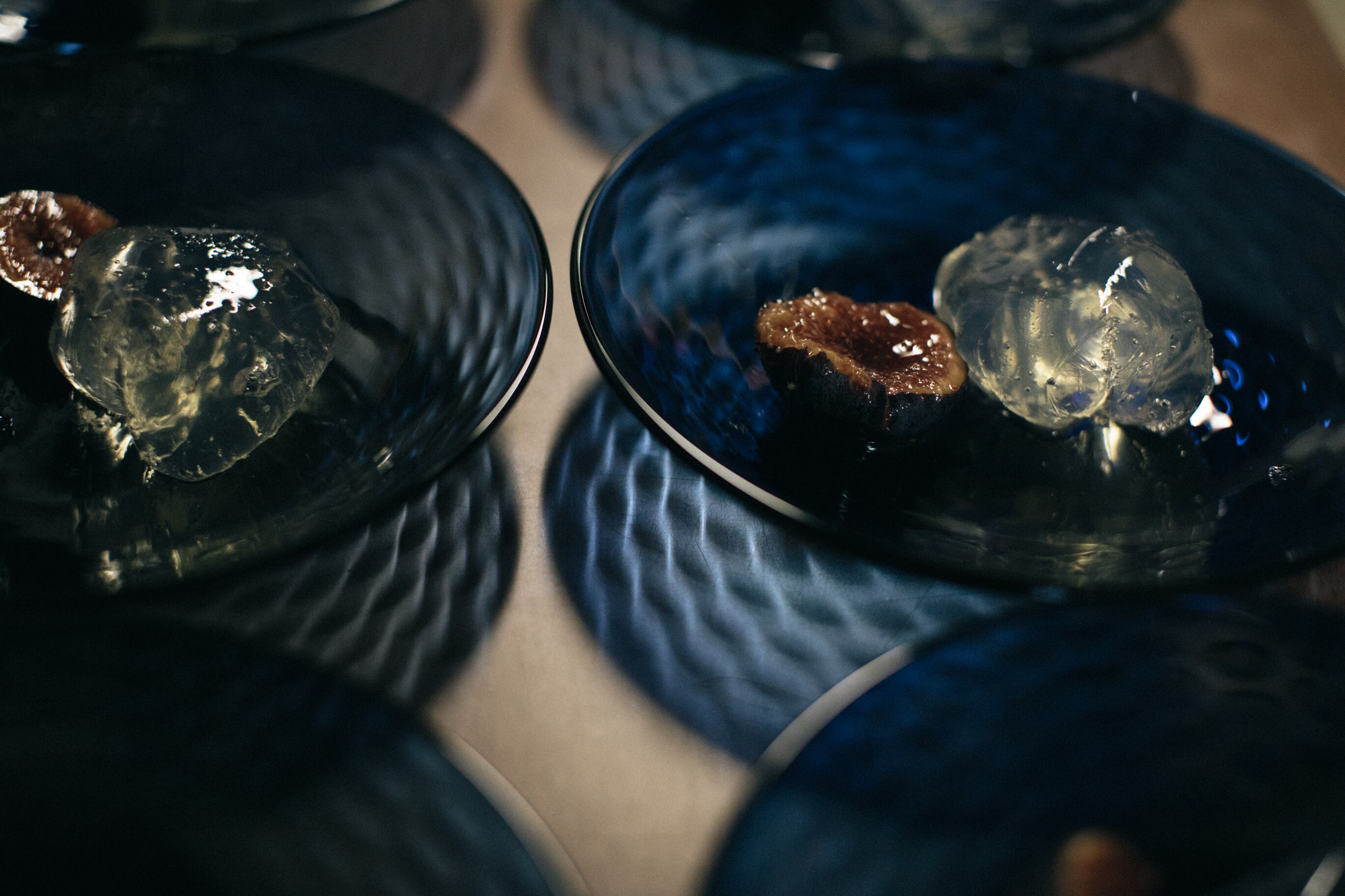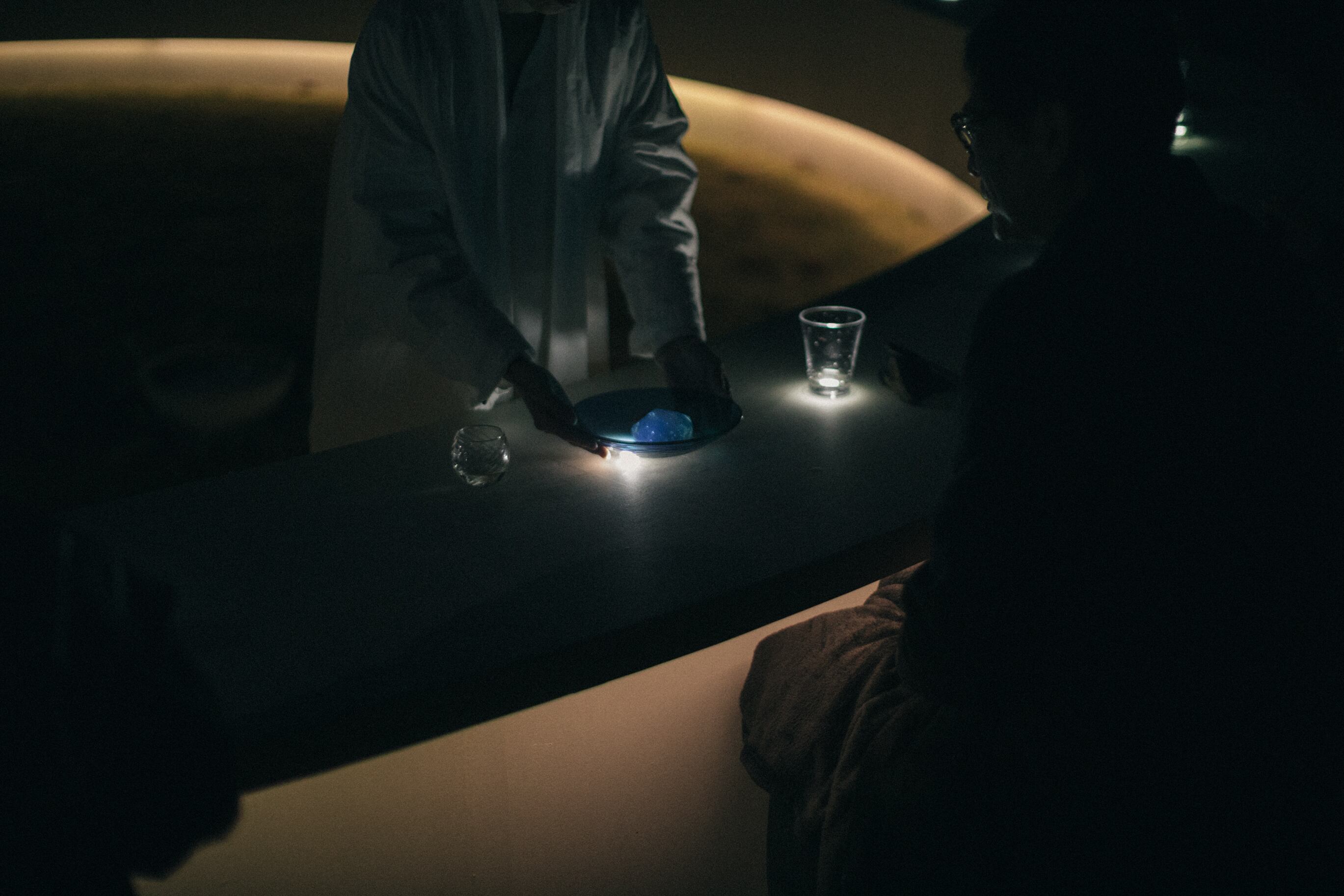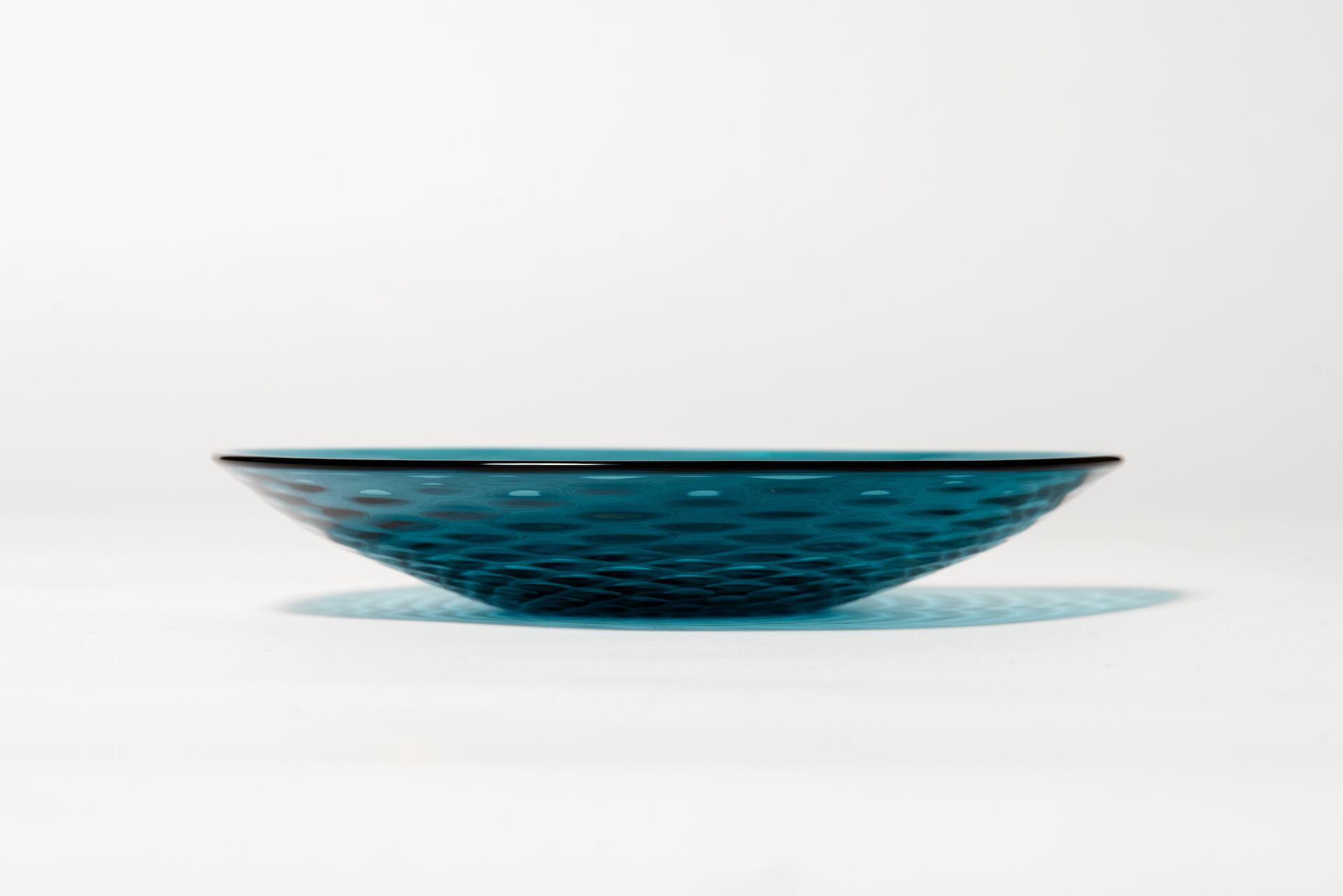 水の波紋と琉璃色美しいガラス皿。温度により液体にも固体にも変化するガラスの流動的な性質が、水のようでもあり、『Osmosis 滲透』の世界観を象徴する作品。